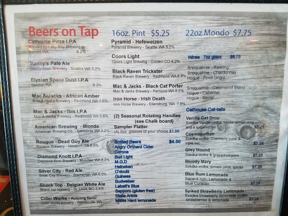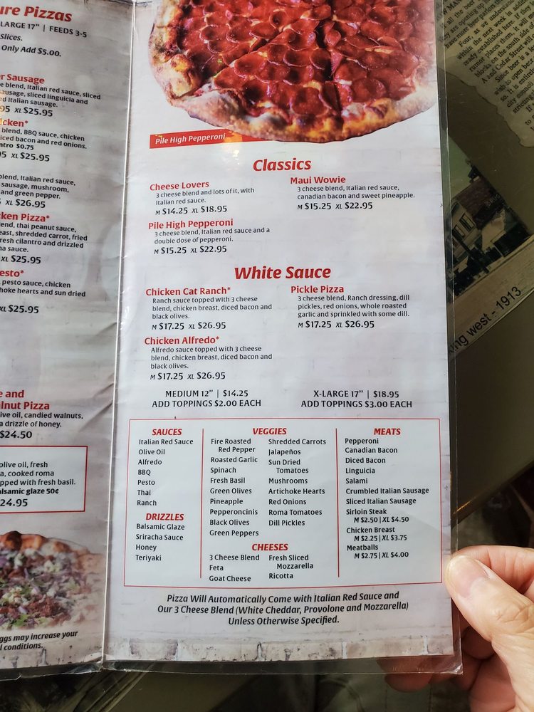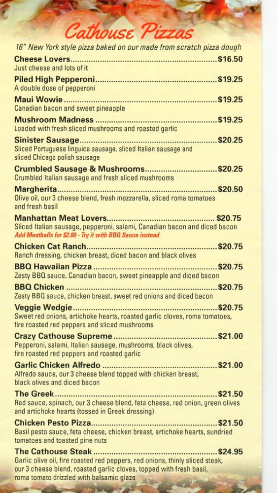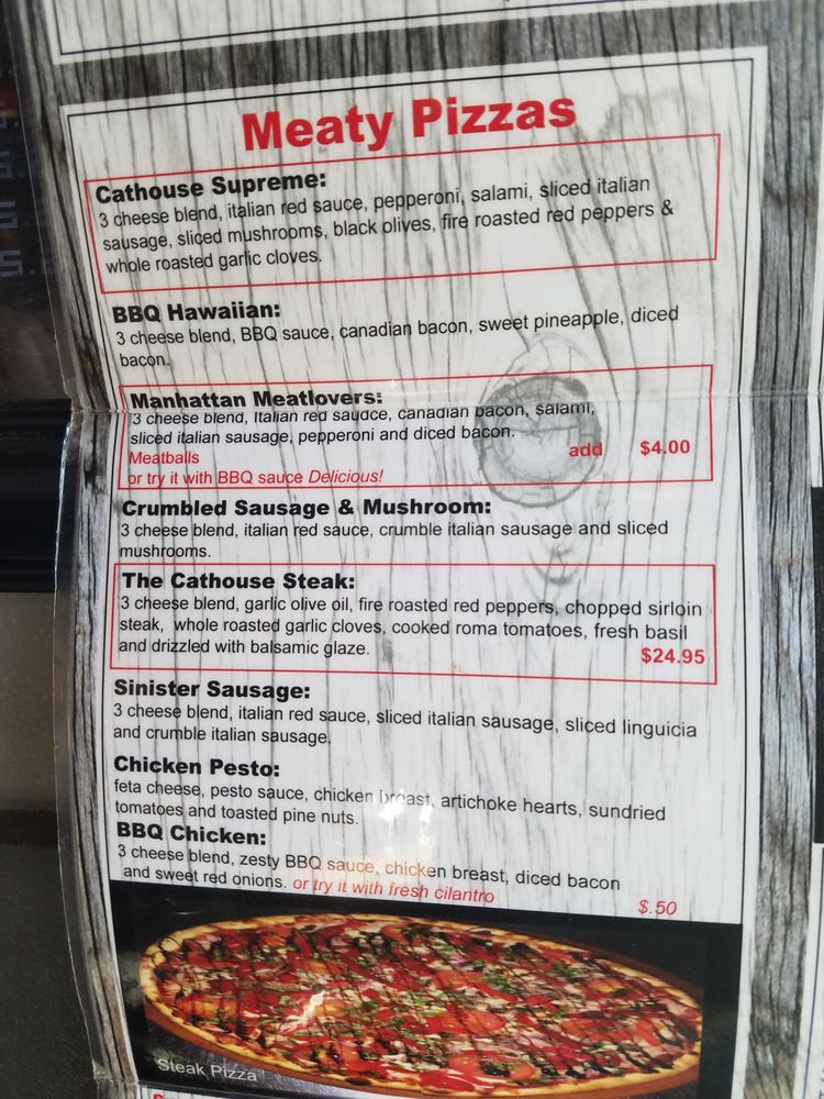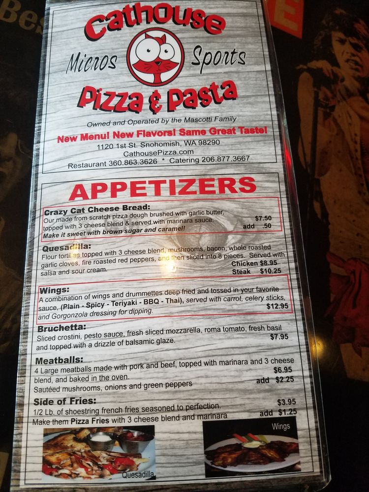 Welcome to Cathouse Pizza, located in Snohomish, WA. This cozy pizza joint offers a variety of options, from meaty delights to vegetarian favorites. Their N.Y. style, thin-crust pizzas are hand-tossed daily, ensuring freshness with every bite. The Cathouse Supreme and BBQ Hawaiian are must-tries for meat lovers, while the Veggie Wedgie and Spinach Pizza cater to vegetarians. With a three-cheese blend of White Cheddar, Provolone, and Mozzarella, each pizza is a cheesy masterpiece. Customers rave about the crispy crust, generous toppings, and friendly service. Whether dining in or ordering for delivery, Cathouse Pizza provides a satisfying pizza experience for all. Don't miss out on their unique Pickle Pizza for a surprising twist on a classic favorite. Visit Cathouse Pizza and indulge in a delicious slice of heaven.
